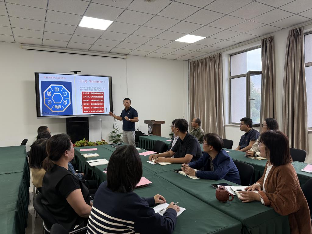活动伊始,学院团总支书记郑丽佳同志以“以教育家精神铸魂强师,谱写教育强国建设华章”为主题,从教育家精神的深刻内涵、身边的教育家榜样、个人工作教育案例、未来展望等几个方面详细分享了个人对教育家精神的理解和学习感悟。随后,开展了学习身边“四好”党员榜样宣传讲述活动。支部书记孙广通作为中央国家机关“四好”党员,结合自身岗位实际,分享了学为人师、行为示范的感悟体会和党支部建设的经验成果。接着,六名教师代表带来了一场精彩的诗歌朗诵《教育是一首诗》,他们用抑扬顿挫的语调,深情诠释了教育的伟大与美好。活动在激昂的《歌唱祖国》合唱中达到高潮,全体教师用歌声表达了对祖国的热爱和对教育事业的无限忠诚,展现出教师们团结奋进的精神风貌,进一步激发大家的爱国情怀和工作热情。