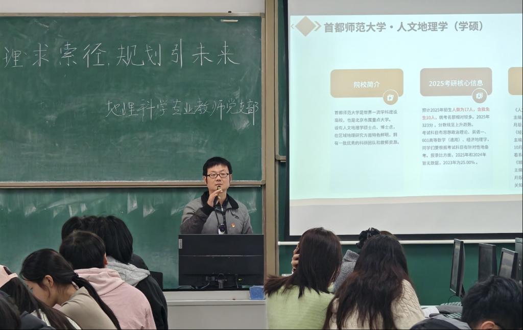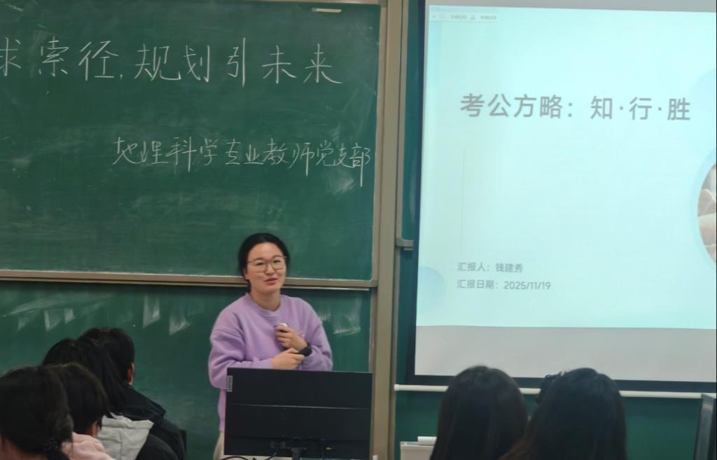 为充分发挥基层教师党支部战斗堡垒作用和党员先锋模范作用,精准服务学生成长成才,助力学生明确发展方向、科学规划未来,11 月 19 日,地理科学专业教师党支部携手非党员教师,在长庚楼 326 教室联合开展 “地理科学专业考公考研就业指导” 志愿服务活动。地理科学专业教师党支部全体党员、非党员教师、240211 班及 250211 班学生共同参与此次活动。