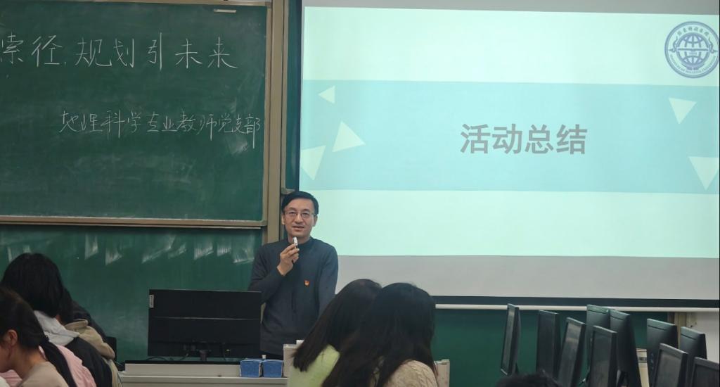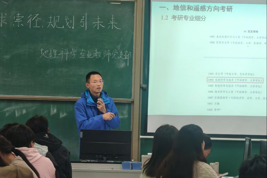 活动现场,各位党员教师结合自身专业领域与教学经验,为学生提供全方位、针对性指导。石云老师系统梳理了地理科学专业就业现状及历年考研整体情况,重点解读自然地理学考研方向核心要点,并从专业知识积累、学习方法优化等方面给出科学的学习规划建议。张达老师聚焦人文地理学和学科地理两大考研方向,详细介绍其专业特色、就业前景,同时针对教师资格证考试的报考流程、备考重点等内容提供了阶段性规划指导。姚尧老师围绕地理信息系统和遥感方向的考研院校选择、专业课程备考、就业市场需求等方面展开讲解,提出提升专业技能、积累实践经验等增强就业竞争力的具体路径。钱建秀老师则从考公认知、岗位选择、备考计划制定、应试技巧等维度,为有考公意向的学生提供了全流程行动指南。